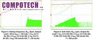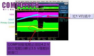 啟動結束時,NCP1032會有1 V的過衝,如果想減小緩啟動結束時的過衝電壓,就要使COMP腳電壓從4.2V到穩態值之間的轉換時間盡可能縮短,也就是說要加快補償回應速度,見圖2。