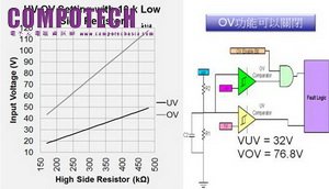 NCP1032有過壓/欠壓管腳,用於輸入電壓的過壓/欠壓保護,管腳6電壓低於1 V或高於2.4 V時,NCP1032功率管會關閉,晶片通過內部高壓電流源進行動態自供電,直到過壓/欠壓釋放為止。欠壓保護和過壓保護分別有70mV和158mV的遲滯。NPC1032兩個版本中,NCP1032B只有欠壓,沒有過壓保護功能。圖5是過壓保護、欠壓保護的設定方法及工作方式。