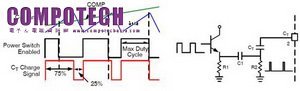 在放電過程中,功率管是關閉的,因此該器件支持的最大工作週期被限制在75%以下。NCP1032支持頻率的外同步,CT設定的工作頻率要比同步頻率低25%,見圖6。