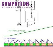 輸入電壓前饋使轉換器可以快速回應輸入電壓的變化,NCP1032通過CT腳也可以支持輸入電壓前饋功能,如圖7。前饋電阻的存在會改變最大工作週期和工作頻率。如果想將最大工作週期設定在固定值,RFF可以接固定電壓。