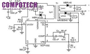 NCP1032內部的PWM比較器和鎖存器延時時間在200 ns以內,如果工作週期小於200 ns,晶片會進入跳週期模式來保證輸出電壓穩定,但輸出電壓紋波可能會有增加。