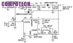 圖11是NCP1032的另一個典型應用——沒有輔助繞組的48 V 至 12.0 V DC−DC轉換器。