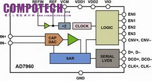 使用於多通道醫療成像以及其它超取樣應用中的高性能、精密資料蒐集系統,需要有最為先進的ADC。AD 7960 18位元、5 MSPS PulSAR® 差動ADC(如圖5所示)採用ADI專利的電容式數位類比轉換器(CAPDAC)技術,提供前所未有的雜訊與線性度,而不會有延遲或是管線延遲。AD 7960會在轉換功能啟動之後大約100 ns之後返回蒐集模式,而且其蒐集時間大約是總週期時間的50%。因此它具有與第二快速的18位元SAR ADC幾近相同的蒐集時間,但是速度卻比後者快了兩倍。這使得AD 7960很容易驅動,並因而舒緩了ADC驅動器的穩定時間需求的重任。該元件提供廣大的頻寬、高精確度(INL:± 0.8 LSB,SNR:99 dB與THD:-117 dB,一般情況下),以及高階資料蒐集系統所需要的快速取樣(200 ns),同時顯著的降低多通道應用的功率消耗與成本。