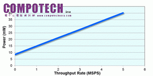 AD 7960能夠以1.8 V與5 V的供電運作,在自我時脈同步(self-clocked)模式下以5 MSPS進行轉換時只需消耗39 mW,在回波時脈(echoed-clock)模式下以5 MSPS進行轉換時只需消耗46.5 mW。該元件的功率消耗與取樣速率呈現線性比例(如圖2所示),因此很適合使用於低功率應用。