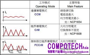 為了滿足大功率LED路燈電源設計在功率因數以及諧波含量限制方面的要求,安森美半導體提供三種工作模式的PFC方案選擇:連續導電模式(CCM),如NCP1654;臨界導電模式(CrM),如NCP1608;頻率鉗位臨界導電模式(FCCrM),如NCP1605。