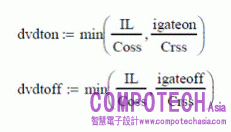 推導出導通狀態下的di/dt公式需要考慮得更周詳。它可以簡單地近似為IL/Trise,其中Trise由資料手冊給出。可是,資料手冊規定的是特定Rg值下的Trise。然而,為了正確分析電路的EMI特性,該模型要允許調整Rg,以便改變di/dt {on}。