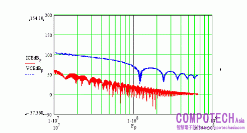 請注意:這是電壓和電流波形的FFT,由單開關換向產生。它不是來自特定應用的傳導或輻射發射頻譜。為了將其轉化成可以在任意應用板上測定的輻射和傳導發射頻譜,必須全面分析應用拓墣,包括換向開關的數量、PWM機制、輸入濾波器和LISN的影響以及板佈局的天線效應。