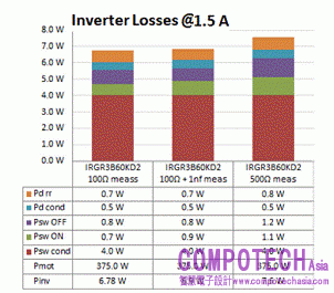圖3對比了向馬達負載提供1.5A電流的三相IGBT變頻器的實測功率損耗,結果顯示將Rg增至500Ω會顯著增加功耗,而在100Ω Rg上添加一個1nF電容對變頻器損耗的影響卻很小。