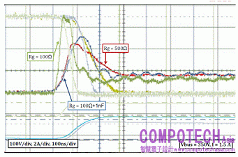 圖4:在100Ω Rgon上添加一個1nF電容能大幅降低導通恢復峰值。