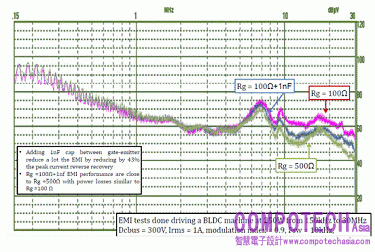 圖5:100Ω Rgon + 1nF電容對EMI的影響和採用500Ω Rgon的情況類似。