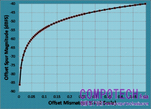 此圖表給了我們一些很好的資訊以及對於我們所能容許增益不匹配位準的更深入洞察。為了要符合典型的70 dBc雜散需求,當我們在此處檢查時,增益不匹配必須要低於8位元轉換器滿量程的0.05%。在像是AD 9286這樣的元件當中,大約滿量程的0.05%典型增益不匹配就可以讓我們達成所期望的70 dBc規格。這會讓我們思考兩組ADC之間的增益需要匹配到多接近才足夠。假如我們可以透過另一個0.025%來減少不匹配,那麼我們就能夠將增益不匹配突波降低至78 dBc。假如我們可以更加的深入並且將不匹配降低至0.005%,那麼我們就可以使突波下降到92 dBc。為了要使突波強度降低至85 dBc,增益不匹配不能多於滿量程的0.01%。這告訴了我們所要面對的是什麼,因此我們知道能夠在容許多少不匹配的情況下,依然可以符合典型的系統需求。