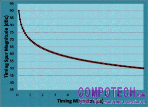 這個結果相較於先前的增益不匹配範例多了一些激勵。500 fs的時序不匹配會造成在fS/2 ± fin下的76 dBc交錯式突波。比起大部分應用裝置所能夠容忍的最大突波位準(70 dBc)還低了數個dB。這仍然會輕易的主宰交錯式ADC的無雜散動態範圍(SFDR)規格。第二與第三諧波以及其它的雜散應該最有可能低於70 dBc。我們希望讓它更降低一些,因為會有一些我們已經使用過的應用 (像是MC-GSM範例)會需要85 dBc或是更好的無雜散動態範圍。在下方的圖4當中展示了時序不匹配突波的強度相對於以皮秒(picosecond)計算之時序不匹配的關係。