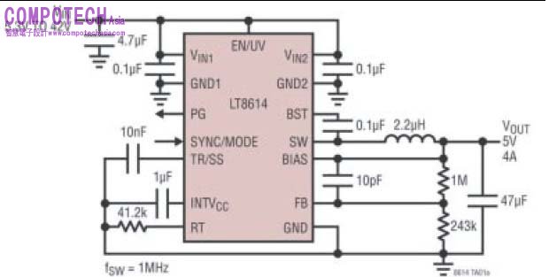 圖說:LTC8614 Silent Switcher 可最大限度地抑制EMI/EMC ,並在高達3MHz 的頻率條件下提供高效率。