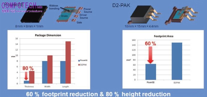 圖:Power 88 及D2-PAK 封裝尺寸與占位面積比較