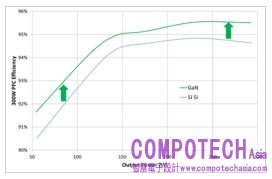 在許多現有電路拓墣中,Cascode GaN比Si提供更高能效。如圖2所示,在連續導電模式(CCM)升壓PFC拓墣中,在200 KHz和120 Vac輸入的條件下,Cascode GaN較超結合Si(SJ Si)提升近1%的效率,隨著頻率的升高,GaN的優勢更為明顯。