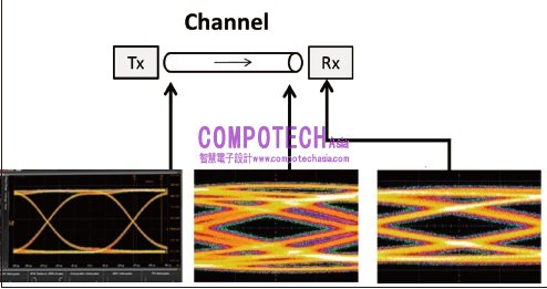 圖:PCIe 3.0 技術結合發射器與接收器等化功能。通道插入損耗通常會導致纜線終端的眼圖閉合,但等化功能可補償該損耗,並讓接收器內部能看到打開的眼圖。