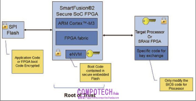 圖 :在圖中的例子中,美高森美 SmartFusion2 安全 SoC FPGA 器件被用作儲存金鑰的信任根,並且對處理器所引導的資料加密