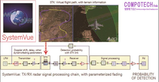 圖: 利用 SystemVue與 STK的應用之一是,執行雷達系統的虛擬飛行測試,例如飛機在虛擬飛行計畫中遭遇攻擊目標和雜波時,進行 DSP、射頻減損、信號傳輸干擾及干擾等測試。