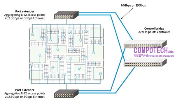 圖1:通過將存取點聚合到高度優化的連接埠延伸器 ,並使其直接連接到25Gb乙太網路的骨幹,被動型智慧連接埠延伸器 (PIPE) 能夠為企業Wi-Fi連接提供一種更加高效率的技術途徑