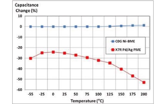 圖:C0G BME MLCC 在500VDC 偏壓下表現出優異的電容穩定性。