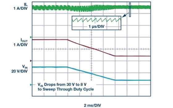 圖:LT836x 系列轉換器提供全範圍的補償機制,在尖峰切換電流限制內妥善運行,不必降低尖峰切換電流限制與工作週期(duty cycle)