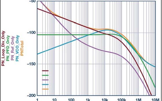 圖:典型的鎖相迴路相位雜訊分析,顯示所有元件的雜訊貢獻。總雜訊是所有貢獻因素的總和。