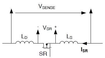 它包括RDSon壓降(VSR)和由di/dt引起的封裝電感(LD,LS)上的偏移電壓。對於高di/dt和封裝電感,該偏移電壓可能很大並且同步整流器經常過早關斷,這導致較長的體二極體導通時間和較大的傳導損耗。