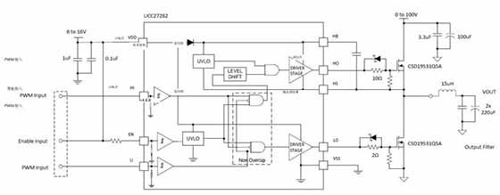 UCC27282 120V半橋驅動器具有多項新特性和參數改進,有助於實現更高水準的電源模組性能和穩健性。EN引腳上的低電平信號可禁用驅動器,將UCC27282設置為非常低的IDD電流狀態。當禁用電源模組時,這種非常低的電流將有助於實現非常低的輸入待機功耗。UCC27282 VDD工作範圍已擴展至5.5V至16V。這可以使設計人員優化VDD工作電壓,以實現更低的柵極驅動損耗。UCC27282包括輸入互鎖功能,防止在LI和HI輸入同時為高電平時,兩個柵極驅動器輸出也同時處於高電平狀態。