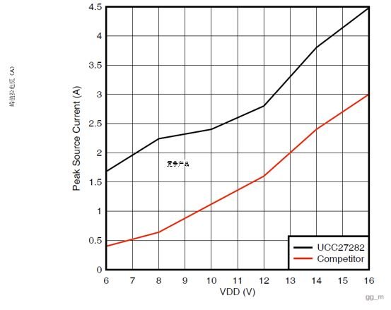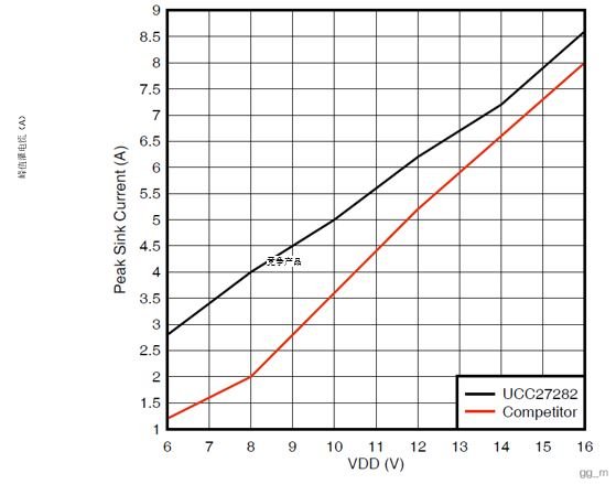 與競爭產品器件相比,UCC27282在較低的VDD範圍內工作時可以保持足夠的柵極驅動強度。這可以獲得功率轉換器效率的顯著提升。