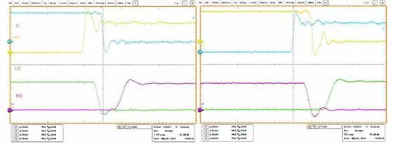 UCC27282驅動器包含輸入互鎖功能,可防止LO和HO輸出同時處於高電平狀態。包括同步降壓、半橋、全橋和全橋同步整流在內的許多拓撲結構都不能容忍高側和低側MOSFET同時導通,否則可能會發生交叉導通,可能導致損壞。有許多事件可能導致電壓尖峰或振鈴超出正常觀測的特性,包括短路或靜電釋放或EFT(電快速瞬變)事件的瞬態等故障情況。這些異常情況可能導致對柵極驅動器輸入信號等關鍵控制信號的干擾。UCC27282在LO和HO輸出上升沿和下降沿之間沒有強制死區時間,因此控制器仍然可以確定時序,以實現精確的死區時間控制。下面的圖9說明了LO和HO輸出都處於低電平狀態,對應於LI和HI輸入上的20ns重疊。