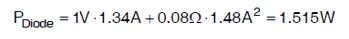 最壞情況下的功率損耗發生在最小線電壓和最大負載時。對於2.1 A的峰值輸入電流、1 V的正向電壓和80mΩ的寄生電阻,可以使用等式22計算每個二極體的總功率損耗: