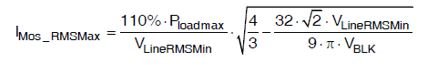其中,IMOS_RMS是MOSFET的均方根電流,RDS_on是MOSFET的導通電阻,Cotemp是與導通電阻相關的溫度係數。開關中的最大電流出現在滿載和最小輸入電壓時: