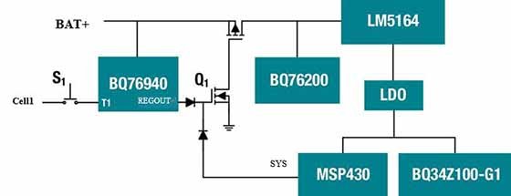 此設計利用我們新的LM5164作為輔助電源。該100 V LM5164是一款寬輸入、低靜態電流降壓DC-DC轉換器,可保護系統免受標稱48 V電池的潛在瞬態影響,並為3.3 V微控制器(MCU)和BQ34Z100-G1供電。LM5164的輸入由兩個信號控制:來自BQ76940的REGOUT和來自MSP430™ MCU的SYS。這兩個信號中的任何一個均為高電平,將導通Q1並啟用LM5164的輸入 - 從而啟用MCU電源。電路板剛出廠且電池管理電路板首次通電時,它處於出廠模式。除BQ76940外,整個系統未上電,實現低至5-μA的出廠模式電流消耗。按下按鈕S1將REGOUT設置為高電平並打開系統電源。當MCU上電時,它會將SYS設置為高電平。無論BQ76940處於關閉模式還是正常模式,整個系統都具有穩定的電源。