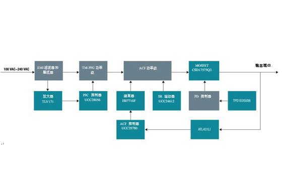 使用德州儀器30 W/in3、93.4%效率、100 W AC/DC適配器參考設計的電路包括基於UCC28056的前端轉換模式功率因數校正(PFC)電路,然後是基於UCC28780的用於隔離式DC / DC轉換的ACF。圖1是參考設計的詳細系統框圖。