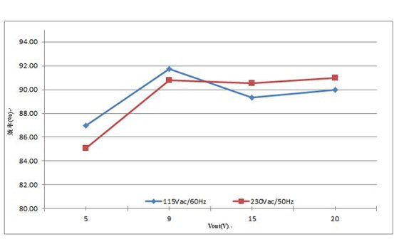 設計師關注的另一重要特徵是該設計的高效率。UCC28780實現了主開關的ZVS和次級整流器的ZCS。次級諧振配置形成初級電流波形,從而降低初級均方根(RMS)電流並顯著改善同步整流器操作。氮化鎵場效應晶體管用於ACF初級側開關,以提高效率,因為它們具有較小的寄生參數。通過在5 VOUT和9 VOUT下關閉PFC級,可進一步提高效率。圖3所示為參考設計的平均效率曲線。