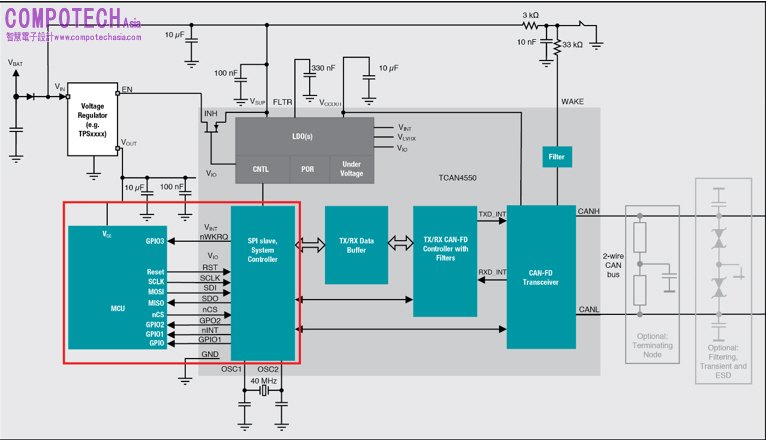 圖1:紅色框框中顯示與處理器/設備連接的TCAN4550-Q1圖例