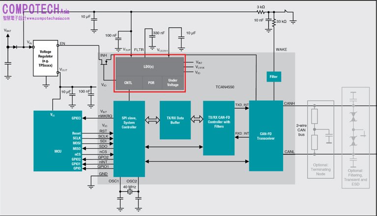 圖2:紅色框框顯示TCAN4550-Q1整合的LDO