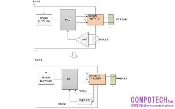 圖3所示為早期一代真空機器人的框圖,其中DRV8870需要外部分流電阻來感應電流,而外部放大器則需要向MCU發送回饋。這需要額外的電路板空間,增加成本,並增加了佈線複雜性和維護。