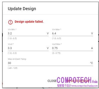由於最小VIN低於VOUT,設計更新失敗。此設計未通過WEBENCH的首檢。