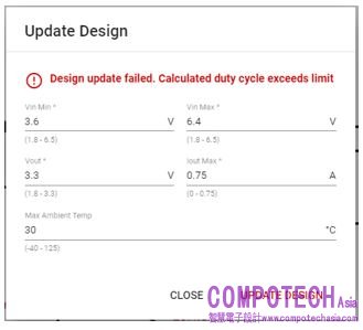 該設計不會更新,因為計算時的占空比包括高側MOSFET RDSON和電感器DCR等損耗。此處,占空比值大於99.9%。此設計未通過WEBENCH的複檢。