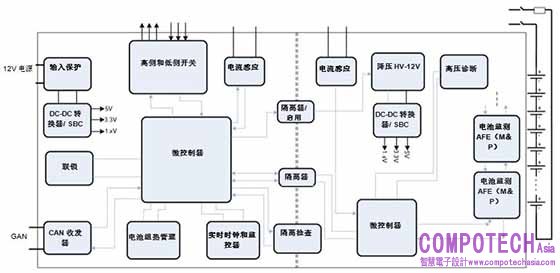 BMS維護和監控電池,包括有效和安全地充電和放電。BMS相對地平衡每個單體電池的電壓和電荷,監控電池的健康狀況,使電池保持安全的工作溫度,並確保更長的電池壽命。BMS應該防止諸如電池反復過度放電,因為這將縮短電池壽命,或應防止過度充電,因為這可能會損壞電池並引起火災或爆炸。HEV/EV中的電池是許多串聯和並聯的鋰離子電池組合,可以滿足所需的電壓和能量。待完全充電後,單個鋰離子電池的電壓為4.2V,放電時接近2.8V。HEV/EV中充滿電的電池電壓範圍為200V至800V。圖2是典型的BMS框圖。