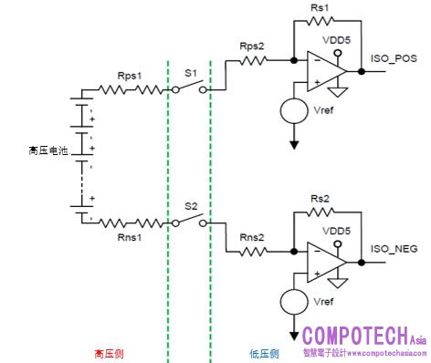 例如,當S1關閉時,如果在負極側無洩漏,則ISO_POS電壓將等於Vref。若在負極側存在漏電流(隔離破壞),則ISO_POS電壓將不等於Vref。由於漏電流流過Rps1、Rps2和Rs1、電池的正極側和負極側到低壓側接地,閉環增益不同。具有低輸入偏置電流的運算放大器適用于此應用,因為連接到反相輸入的阻抗可能非常高(在兆歐範圍內)。