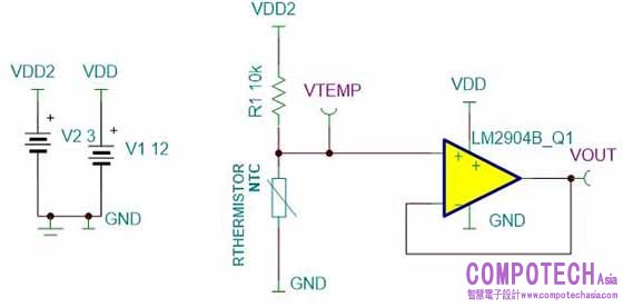 圖7:使用NTC熱敏電阻和運算放大器進行溫度感測