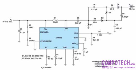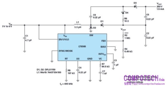 圖4所示的轉換器利用3 V輸入,將125 V輸出提升到250 V輸出,且支援約1.5 mA電流。在通訊領域中,有許多元件都需要從低輸入電壓源中獲得這麼高的偏置電壓。