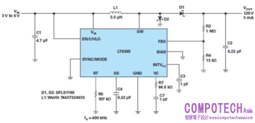 圖3. 3 V輸入到125 V輸出的升壓轉換器。