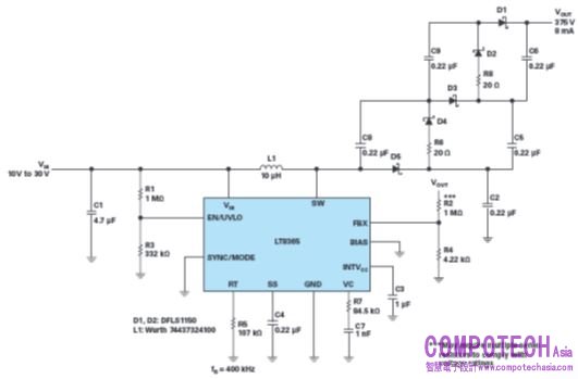 LT8365提供單個FBX針腳來檢測輸出電壓。如本文中所示的所有示意圖一樣,其由連接到FBX針腳的簡單電阻分壓器來檢測輸出電壓,無論輸出極性為何。