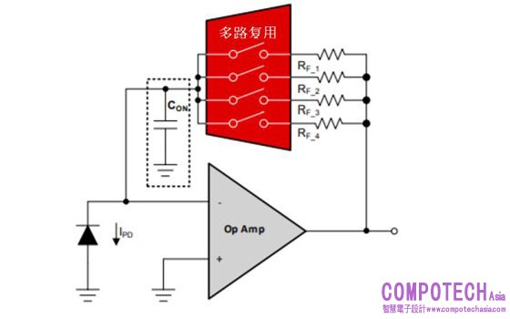 忽略多工器的CON規範時,TIA電路可能會出現穩定性問題。多工器的CON可能會引起振盪,從而導致信號鏈的瞬態性能較差。儘管系統設計人員可能不會有意在設計中增加電容,但多工器的CON可能足夠大,以至於影響系統。