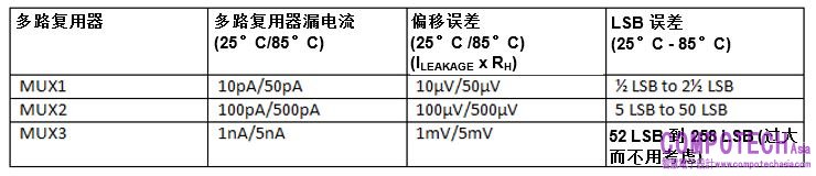 請記住,工程師有三個多工器可以選擇,在表1中標記為MUX36D04、MUX2和MUX3。還要記住(25°C/85°C)時的漏電流是唯一的區別因素。對於每個多工器,漏電流流過輸入阻抗,導致偏移誤差,從而影響整個系統精度。表1簡要地介紹了多工器是如何影響測量精度的。