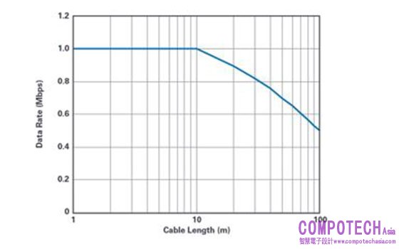 但是請注意,雖然使用了SPI中繼器,資料速率仍是有限的,取決於電纜長度。例如,圖1中使用100米CAT5電纜的電路的資料速率僅為0.5 Mbps左右,是LTC6820所能提供的1 Mbps最大值的一半(見圖2)。