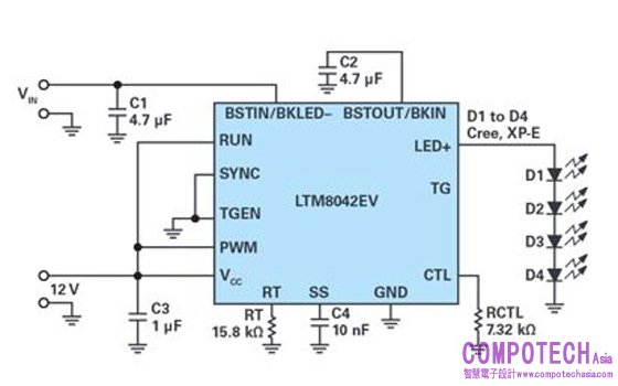 圖1.LTM8042驅動四個LED,其中VIN = 5.75 V至10.25 V,IOUT = 0.5 A。